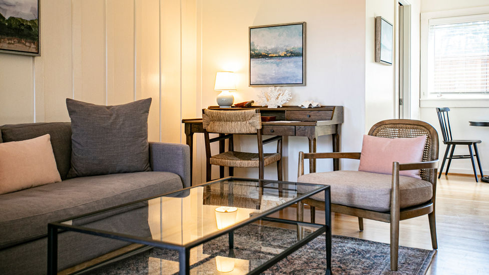This two-room retreat blends cozy design with natural texture. The sitting room features a double-sided gas fireplace, casting warmth into both the lounge and bedroom. Furnishings are deep and inviting—meant for reading, writing, or doing nothing at all. Doors open to a private, furnished deck with a partial ocean view—framed by sky, trees, and sea air.