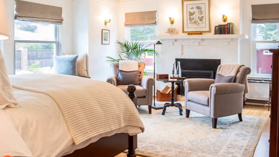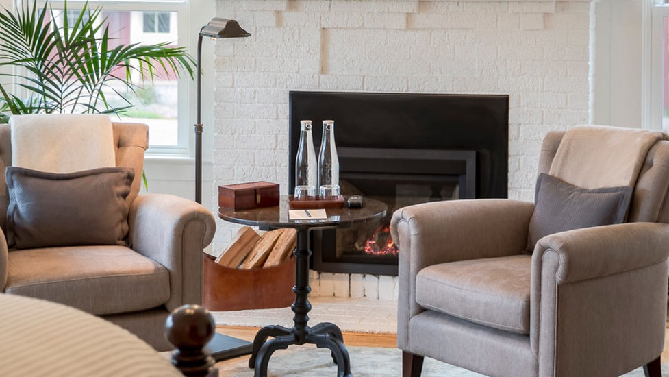 Our only ADA-accredited guest room, Greenwood is located on the ground floor and welcomes all guests with comfort and care. A queen bed anchors the space, while a gas fireplace brings warmth to the gentle palette. The window seat, bathed in soft light, invites a moment of stillness—tea in hand, book nearby, Highland cattle grazing just beyond the window.