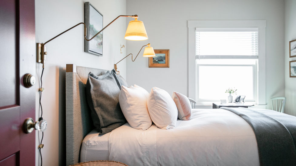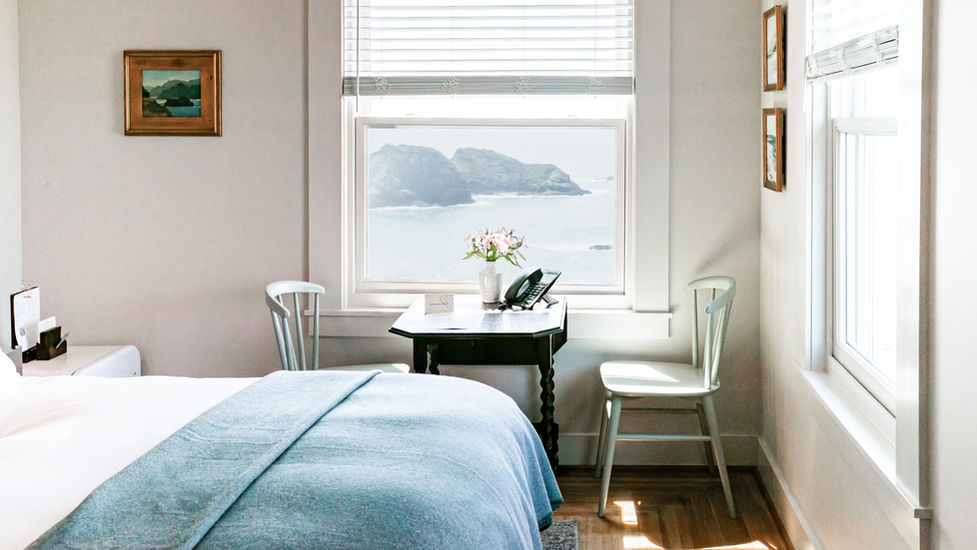This second-floor guest room may be intimate, but it holds one of the inn’s most expansive outlooks—framing the gardens below, the rugged ‘wharf rocks’ beyond, and the graceful arc of St. Anthony’s Point meeting the sea. It’s a painterly view, ever shifting with light and tide.